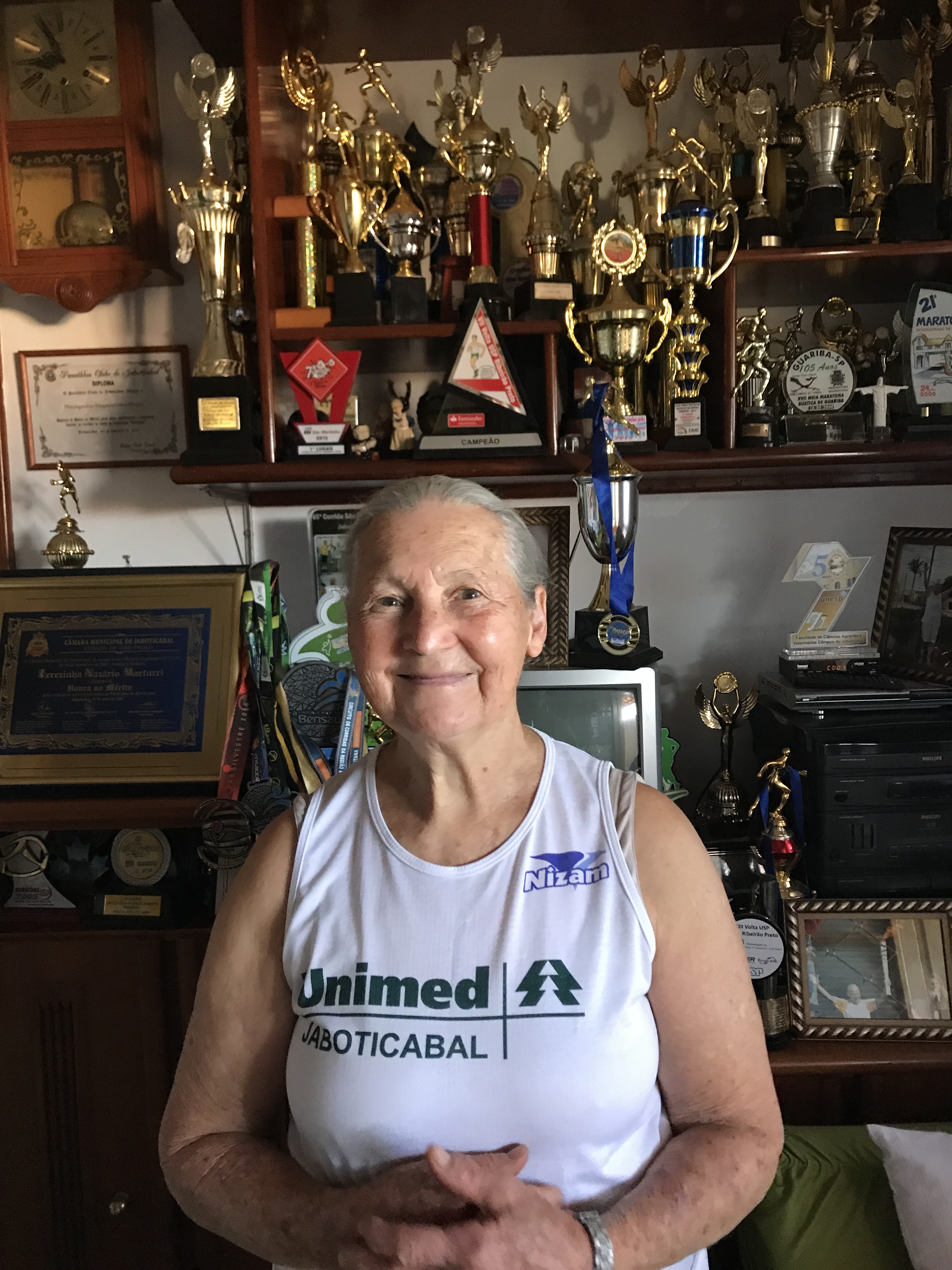 Ela já correu cerca de 300 corridas, participou de seis maratonas e umas 20 meias. Como premiação deve ter uns 200 troféus, muitos diplomas, quadros de homenagens, diploma de cidadania, de mulher filantrópica e a Tocha Olímpica, que carregou em 2016. “Faço natação, musculação e ando seis quilômetros às segundas-feiras pela manhã e corro 10 quilômetros no fim da tarde. Na terça, faço natação. Às quartas, levanto às 4h, preparo o almoço, deixo tudo pronto e faço faxina. À tarde corro 10 quilômetros. Quinta-feira tenho natação e musculação pela manhã e corrida à tarde. Sexta também corro e nado e, aos sábados, são 20 quilômetros de corrida. No domingo, descanso dos treinos, mas trabalho em casa”, conta a homenageada.